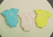 Baby Onesie cookies are cut from vanilla or almond butter cookies, and can be wrapped as shower favors.
